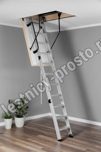 Складная 3-х секционная чердачная лестница. Рабочая поверхность полностью выполнена из алюминия. Термоизоляционная крышка типа "сэндвич" имеет усиленную теплозащиту, облицована с двух сторон ДВП белого цвета. По контуру короба имеется уплотнитель; Все металлические элементы лестницы покрыты порошковой краской.