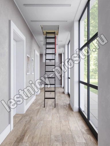Лестница обладает повышенной теплоизоляцией и низкими показателями воздухопроницаемости крышки. Облегченная крышка люка изготовлена из пенополистирола без применения дополнительных деревянных элементов. Наконечники имеют возможность регулировки, что позволяет подогнать длину лестницы по высоте помещения в случае излишнего подрезания лестницы или изменения толщины пола.
