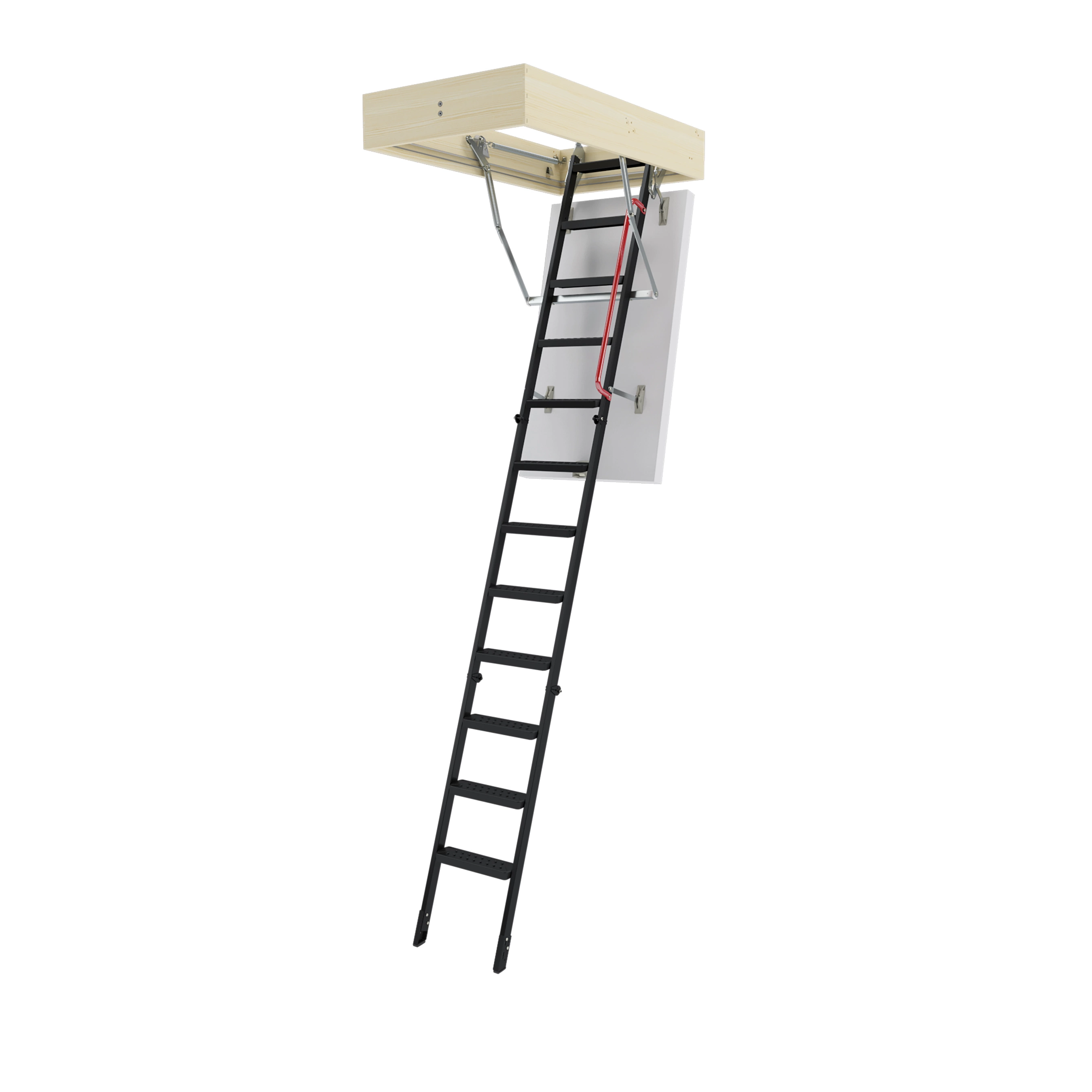 Лестница обладает повышенной теплоизоляцией и низкими показателями воздухопроницаемости крышки. Облегченная крышка люка изготовлена из пенополистирола без применения дополнительных деревянных элементов. Наконечники имеют возможность регулировки, что позволяет подогнать длину лестницы по высоте помещения в случае излишнего подрезания лестницы или изменения толщины пола.