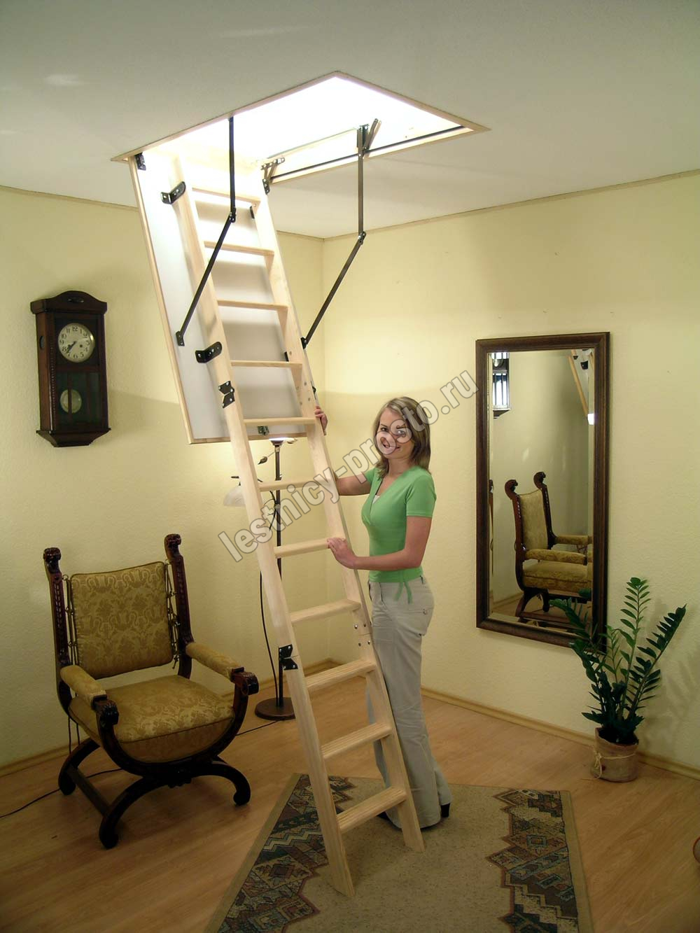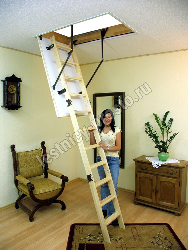 Лестница складная трёхсекционная, изготовлена из сосны. Термоизоляционная крышка типа "сэндвич" утеплена пенопластом, облицована с двух сторон ДСП белого цвета. Короб люка с однослойным уплотнителем. Все металлические элементы лестницы покрыты порошковой краской, ступени лестницы имеют антискользящие насечки и закреплены в столярное соединение «ласточкин хвост», что позволяет выдерживать нагрузку до 150 кг. Деревянный стержень для открывания лестницы в комплекте.