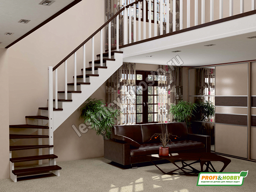 Цена указана за лестницу с дубовыми ступенями и поручнем, остальные элементы - сосна. Возможно изготовление этой лестницы целиком из дуба. Базовый комплект включает в себя деревянные элементы лестницы и ограждения без какого-либо покрытия.
