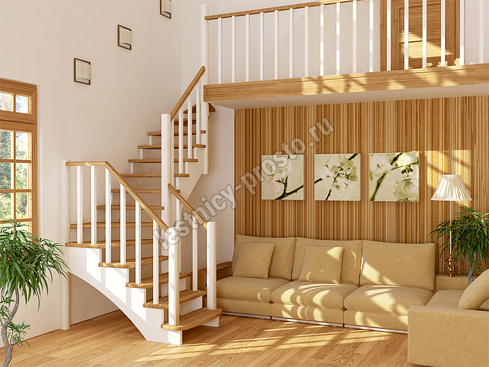 Ступени и поручень лестницы выполнены из ясеня, остальные элементы из сосны.