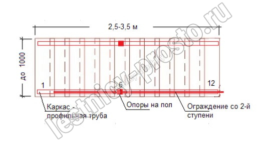 Ограждение начинается со второй ступени лестницы.<br>