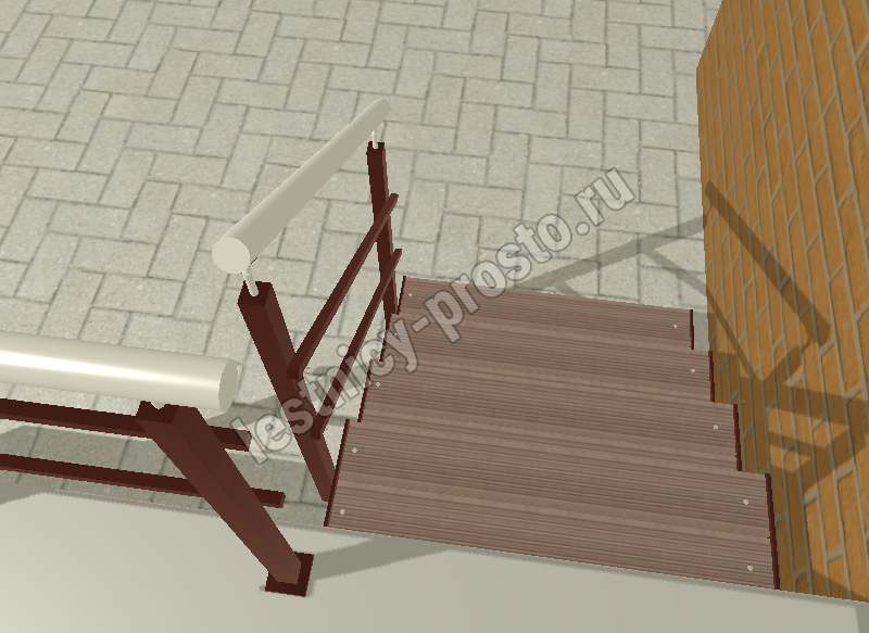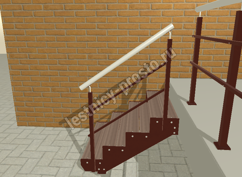 Ступени лестницы состоят из металлической рамки, обеспечивающей необходимую прочность, и покрытия из террасной доски ДПК (древесно-полимерный композит). Ступени не боятся воды и мороза, не теряют со временем свой внешний вид и не требуют ухода.