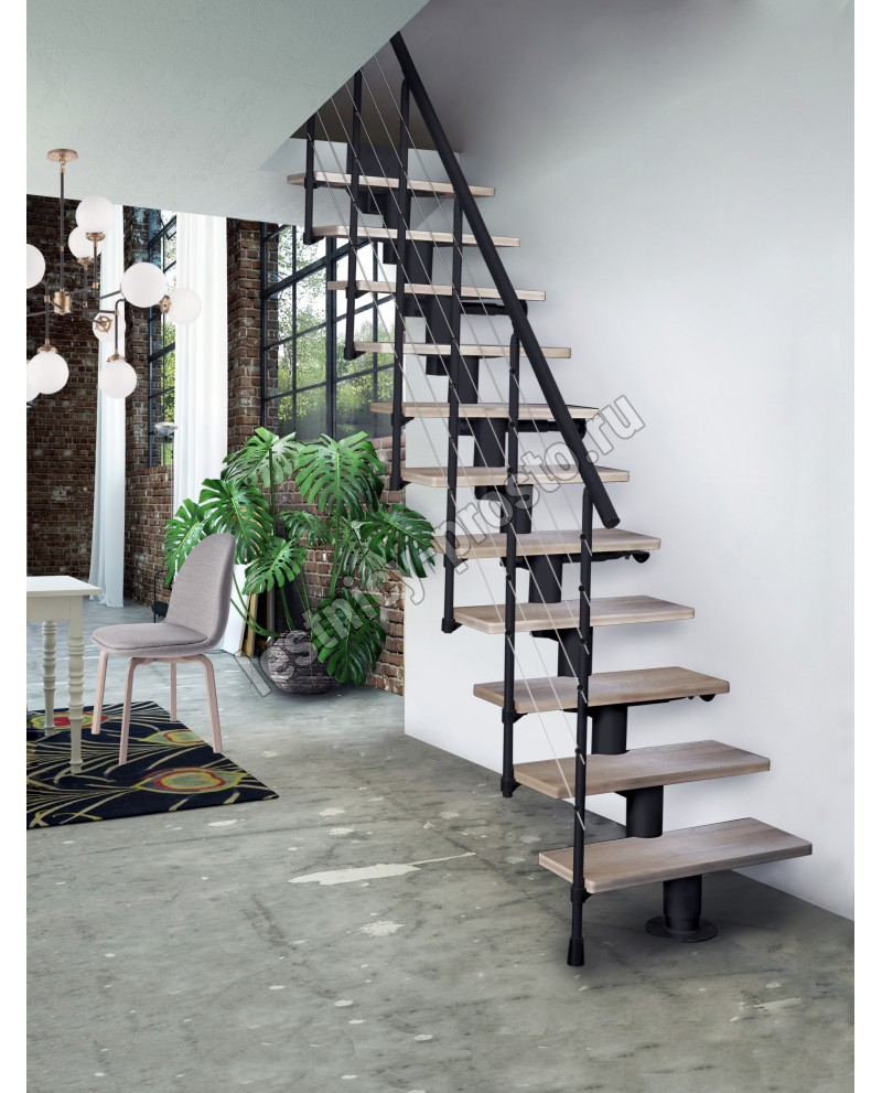 Лестница на стальном модульном каркасе. Высота лестницы регулируется при сборке засчет регулировки высоты шага. Ступени покрыты защитным лаком. Ограждение из стали с пластиковым поручнем. В комплект входят перила с вертикальными стойками и горизонтальными перегородками. Изделие поставляется с шурупами (кроме потолочных и напольных анкеров), инструкциями по монтажу и эксплуатации и гарантией. Внимание! Для этой лестницы необходимо крепление к стене.