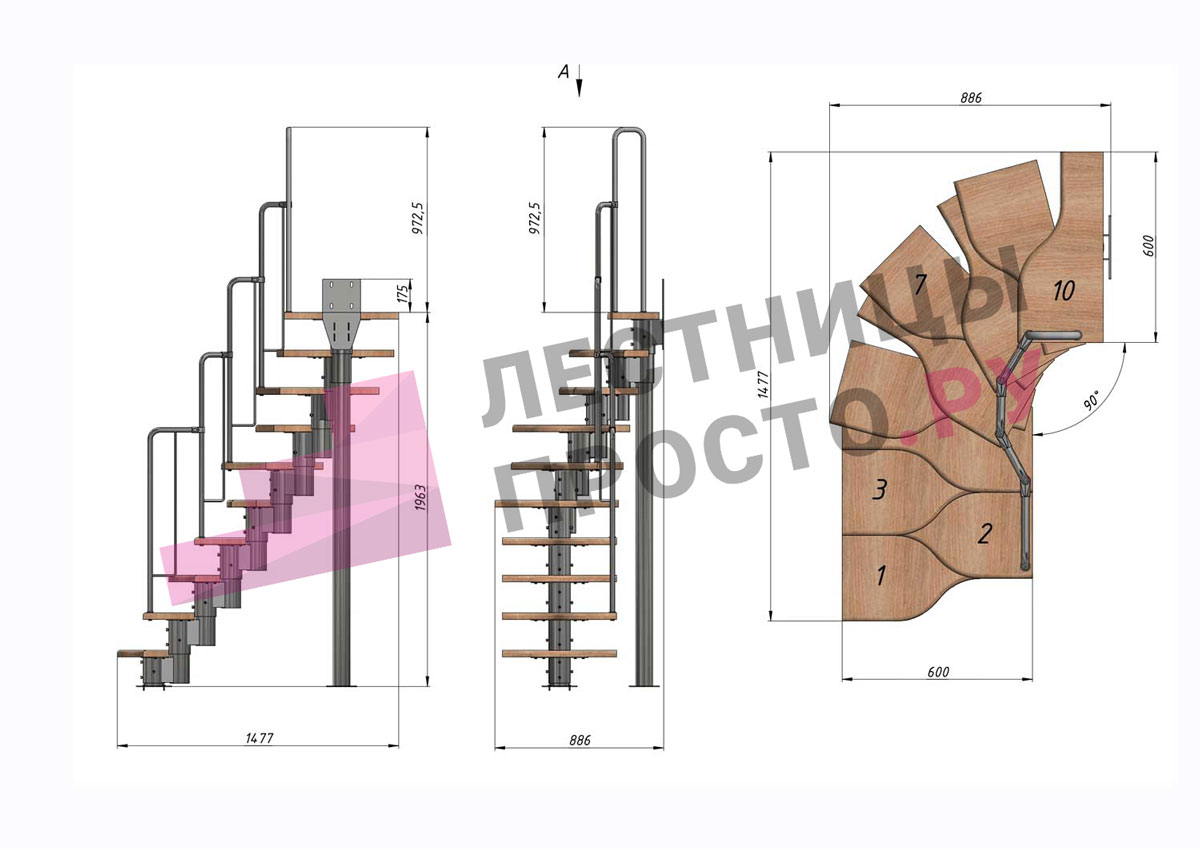 Высота лестницы 1800 - 2640 (10 ступеней) мм