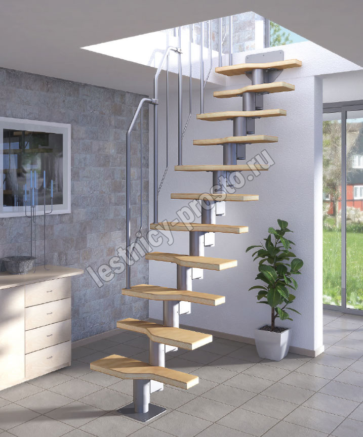 Модульность конструкции позволяет регулировать высоту лестницы при сборке и собрать необходимый поворот до 90 градусов. Ограждение устанавливается на любую сторону.