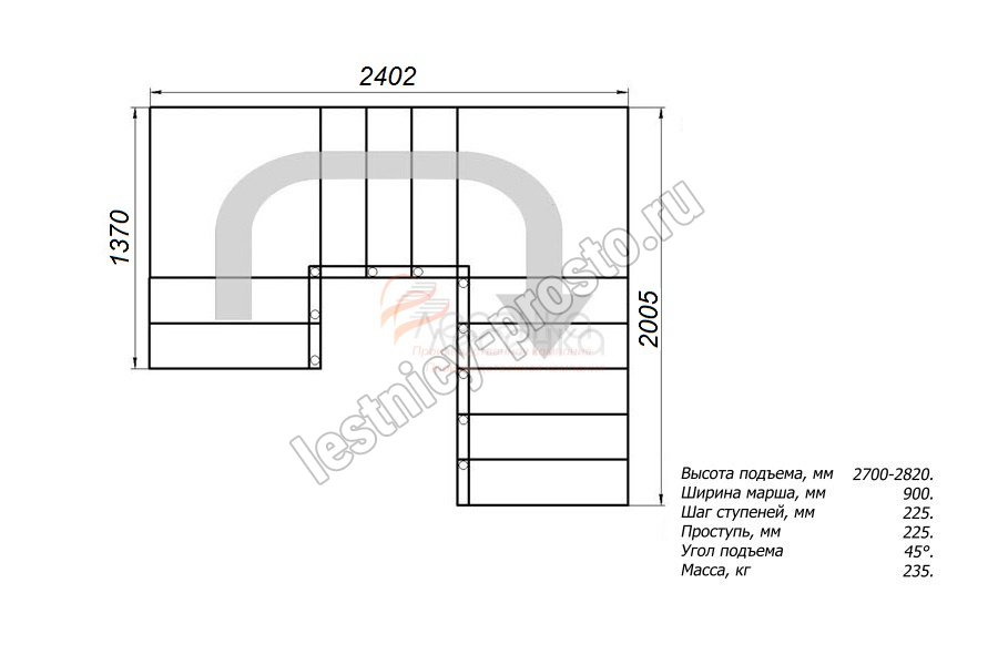 Модульная лестница Комфорт 225 2700-2820, Серый, Сосна, Нержавеющая сталь
