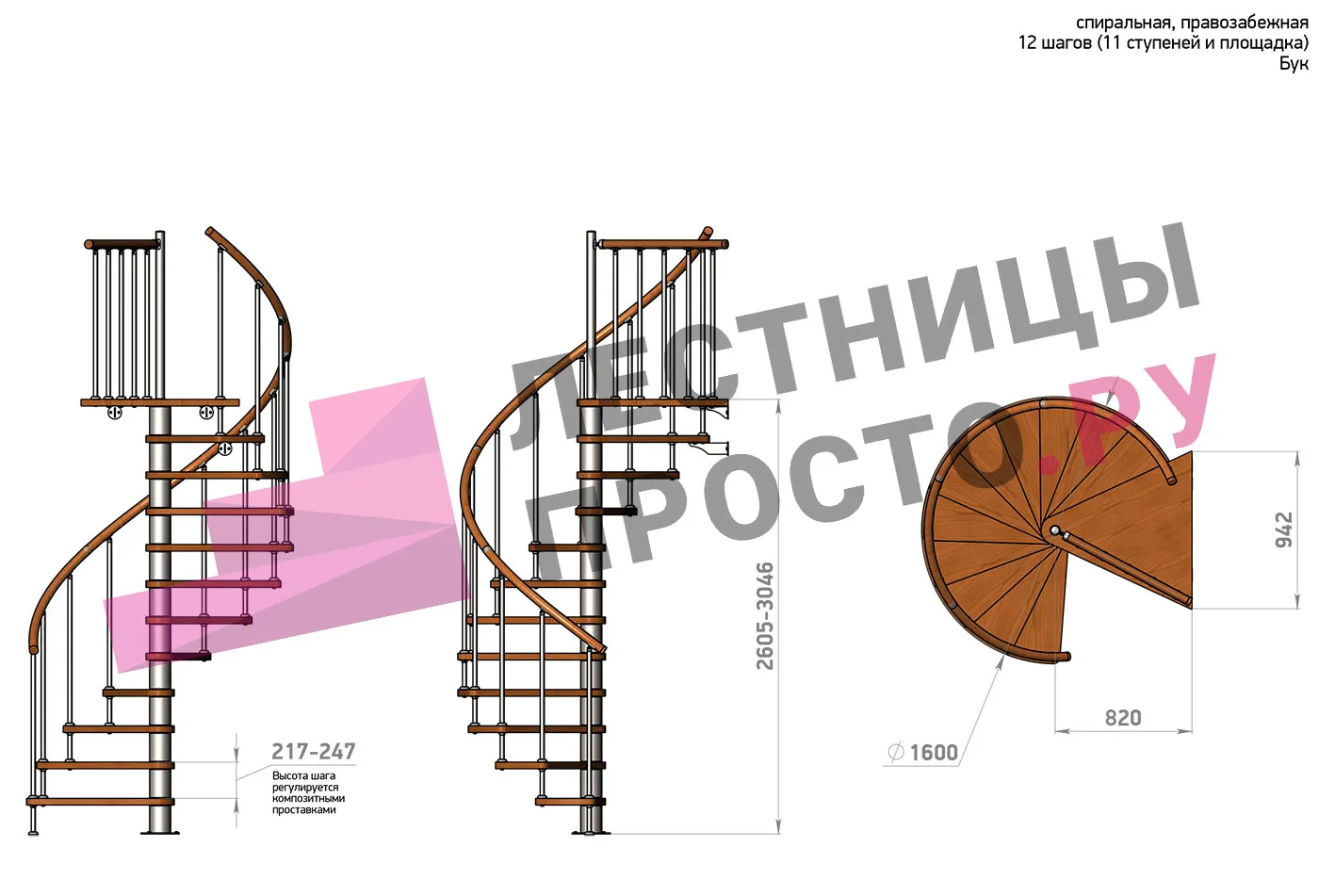 Винтовая лестница Prosto Spiral Black D160см, h260.5-304.6 см, бук
