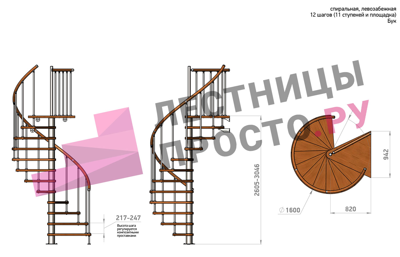 Винтовая лестница Prosto Spiral White D160см, h260.5-304.6 см, бук