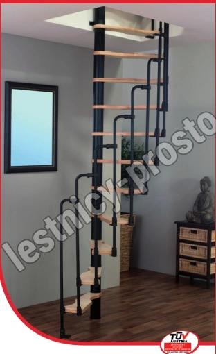 Компактная надёжная лестница. Ступени толщиной 30 мм, изготовлены из массива берёзы по технологии Multiplex, лакированные. Все металлические части оцинкованы горячим способом и покрыты порошковой краской - черного цвета; Лестница имеет надёжную несущую стальную конструкцию.