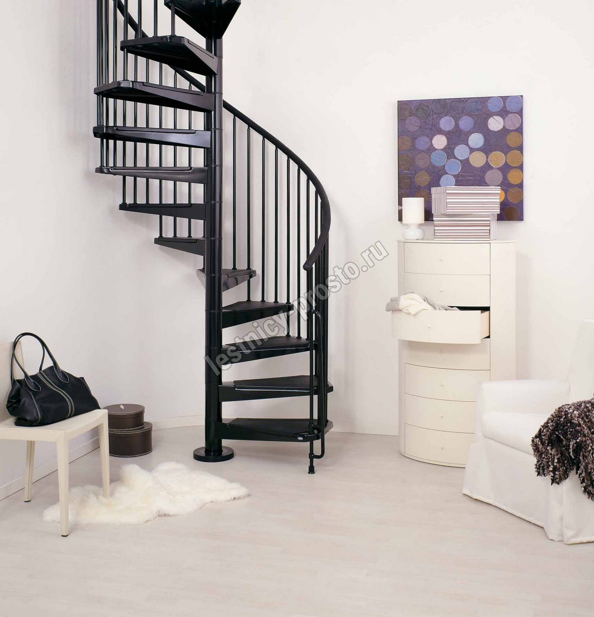 Отделка лестницы всегда в черном цвете. Перила из полиуретана с алюминиевым сердечником черного цвета, как и износостойкие нескользящие панели на ступенях.