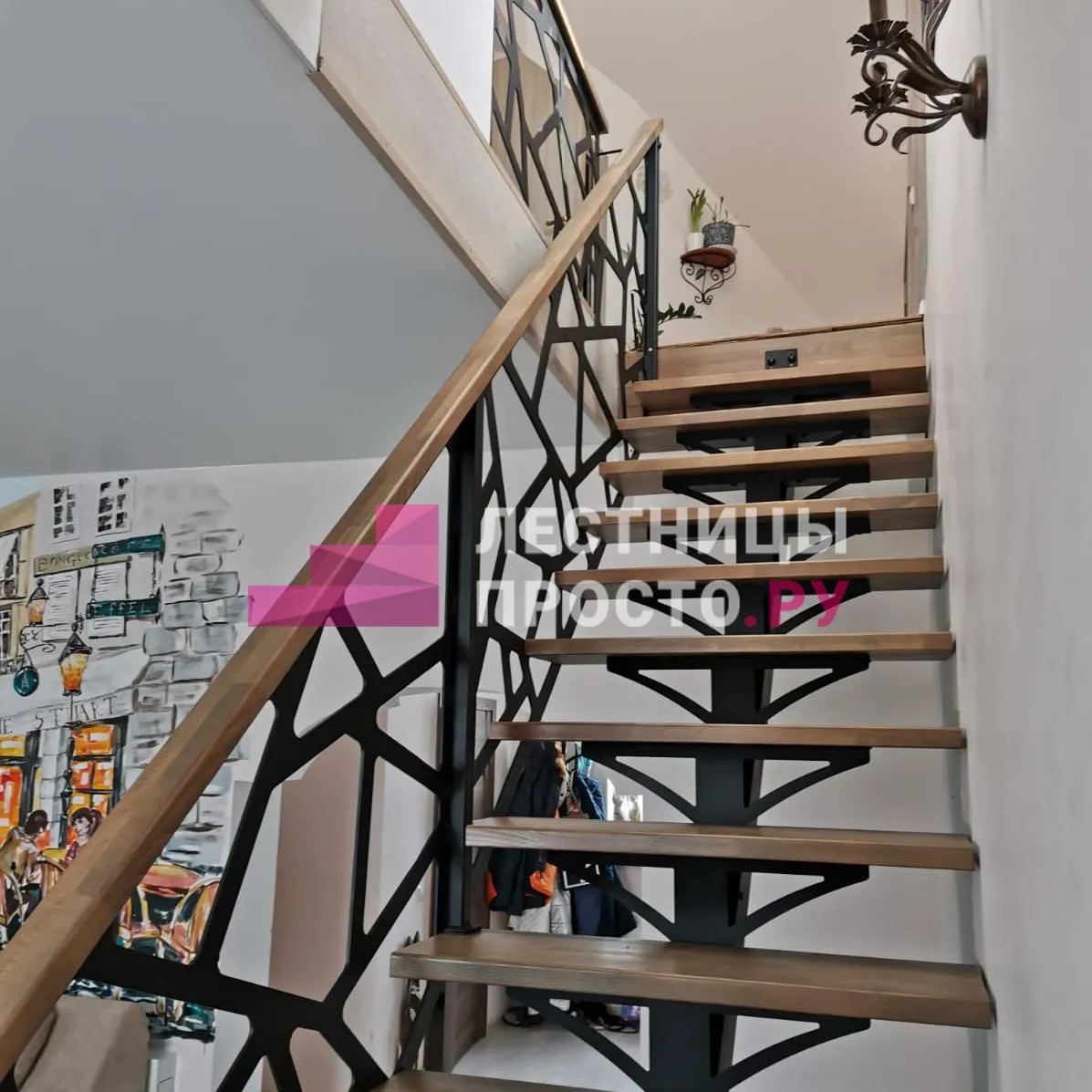 Лестница из ясеня с кованым ограждением по индивидуальному проекту LP-055